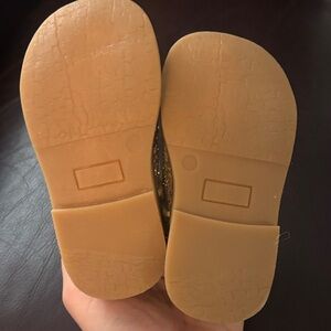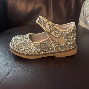 Sparkling champagne glitter upper adds playful shine. Comfortable cushioned insole for all-day wear. Secure adjustable strap with buckle for a snug fit. Versatile dress shoe perfect for special occasions.