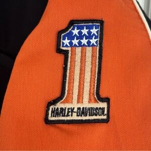 This Harley-Davidson button-up shirt features a classic black and orange color-blocked design with "Since 1903" patch on shoulder, patches and embroidery.