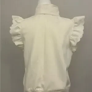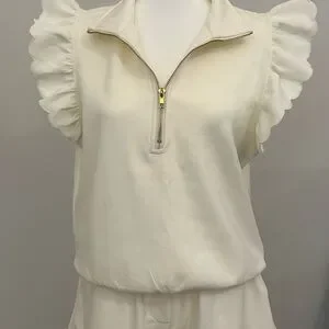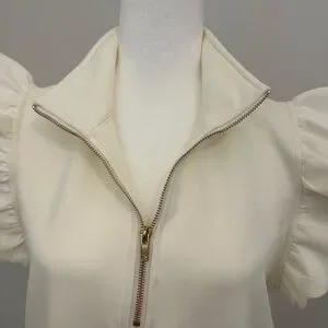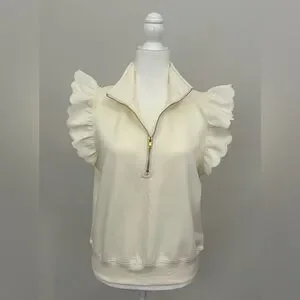 Chic cream modal top with ruffle sleeves. Features a stylish zip-up front. Scallop edge detail and stretch waist.