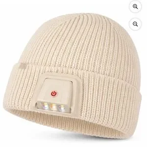 Warm up with this beige heated beanie featuring an LED light. Perfect for outdoor activities.