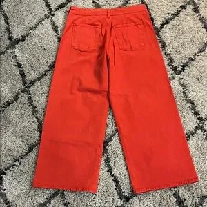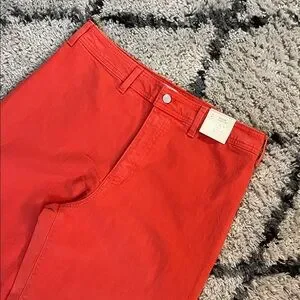 High-rise wide leg pants in a vibrant red. Clean silhouette with button and zip closure. Bold color makes a statement.