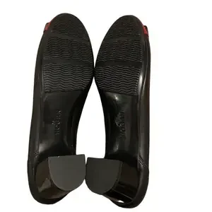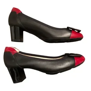 Elegant black smooth leather Hogan pumps with striking red patent leather cap toes topped with signature Hogan logo buckles, red patent ankle detail, and black patent leather 2" block heels. Perfect blend of chic and comfortable, these classic style pumps have padded insoles and are cushioned at back of ankle (see 2nd photo). New without tags, these shoes haven't been worn but do have some minor scuffs on leather and buckles as shown in photos. Price reflects issues.