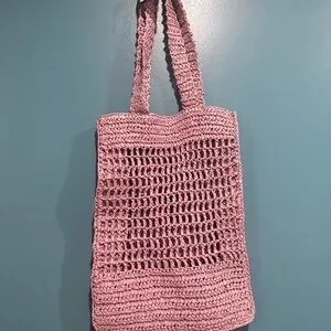 Chic pink tote with open weave design. Perfect for casual outings. Easy to carry.