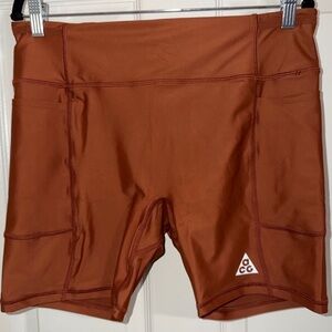 Nike ACG trail biker shorts in rust/burnt orange. High-waisted performance fit with side pockets and stretch fabric designed for hiking, training, or trail running. New with tags, size M