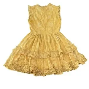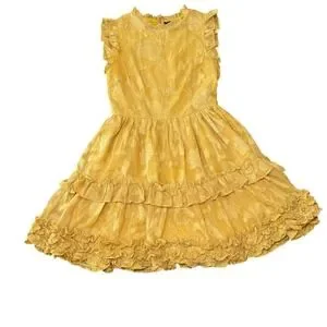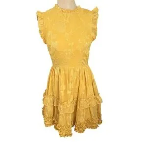 Sun-kissed and ready to twirl, this vibrant yellow dress evokes pure joy. The delicate floral pattern adds a touch of whimsy, while the ruffled sleeves and tiered skirt create playful movement with every step. Imagine the compliments as you make your entrance. The cinched waist accentuates your figure, while the soft lining ensures comfortable wear all day long. Picture yourself basking in golden hour light. This dress is perfect for a garden party, a summer wedding, or a romantic date night.