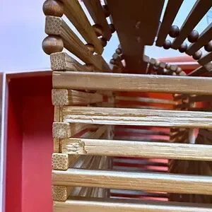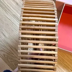Handcrafted bamboo slatted clutch with iconic semi-circle silhouette. Integrated top handle for easy carry. Natural tan finish pairs with casual or dressy looks. Lightweight and sculptural statement piece.