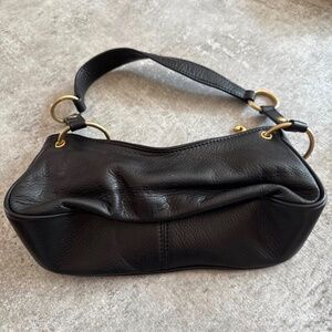 Vintage Juicy Couture Black Leather bag with gold details and mirror. Vintage hot pink tag Bag protector included. Pristine interior. Leather mirror in perfect condition and easily accessible. 11 inch bottom 4 inches deep Interior pocket with design As seen in tag; 100% genuine leather True Y2K Vintage bag Gold accents in excellent condition. Small dent in front heart in photo.