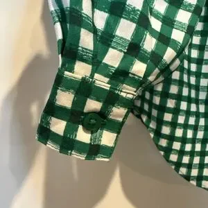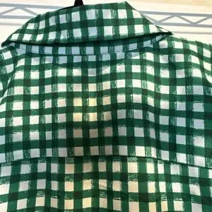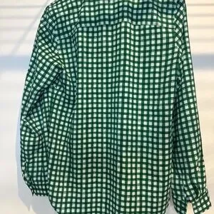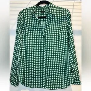 Ann Taylor long-sleeve button-down with green and white gingham pattern. Soft-feel fabric and classic collar. Straight hem and simple cuffed sleeves. Timeless casual-to-office style.
