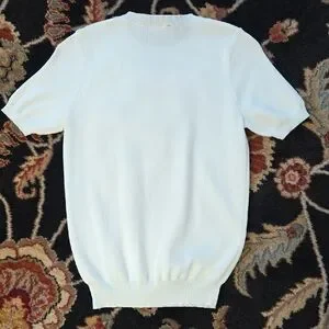 Elegant white top with floral embellishments. Features short sleeves. Perfect for a chic look.