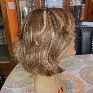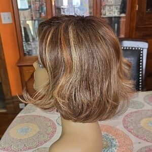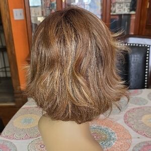 Natural-looking short wavy wig in chestnut brown with warm blonde highlights. Lightweight cap for comfortable wear and easy styling. Soft, blended color for a realistic finish. Versatile look for everyday or dressy occasions. Like new! Average cap