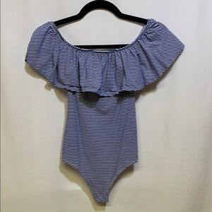 This chic one-piece bodysuit by J. Crew features a striking blue and white pinstripe pattern, complemented by an off-shoulder design with a dramatic ruffled overlay. The form-fitting silhouette offers a stylish and feminine look, perfect for any occasion.