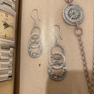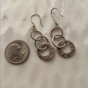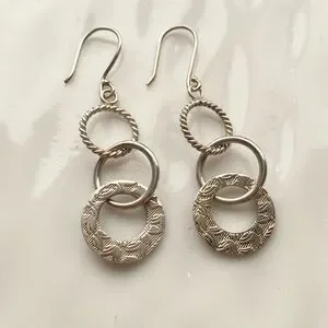 Elegant Oxidized Sterling Silver drop earrings featuring three textured interlocking rings. Lightweight, polished design adds subtle shine to any outfit. Classic silver color complements both casual and dressy looks. In very Good Condition!
