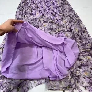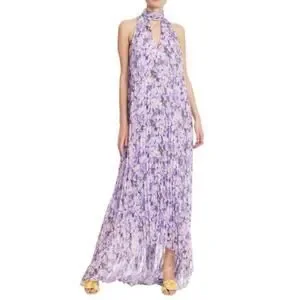 The airy, pleated georgette fabric is cut in a sleeveless, flowy silhouette that moves with you. The halter neckline ties at the neck with a soft keyhole detail, and that laid-back shape drapes into a high-low hemline that sways with every step. Then there's the all-over lilac waterlily print, pulling it all together with a garden-fresh, spring-ready edge.