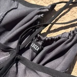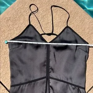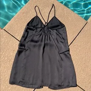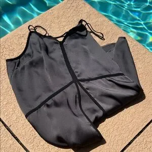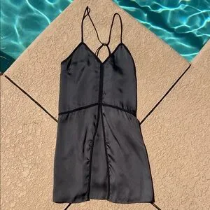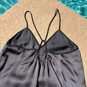 Elegant gray and black satin slip chemise with delicate spaghetti straps. Soft, lightweight fabric for comfort, fully lined. Simple, flattering silhouette with subtle seam details. Easy-care and versatile for everyday wear. Black accents add timeless sophistication. Great condition