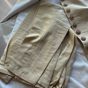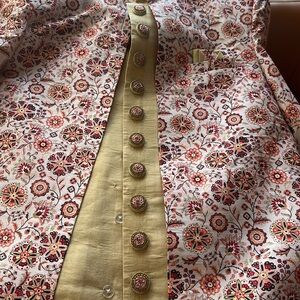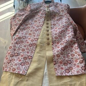 Worn once! In excellent condition. Peach jacket with floral design. Sleeveless gold kurta and pant.