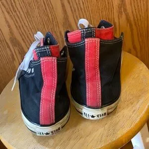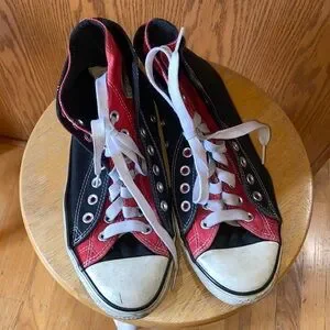 Classic high-top canvas sneakers in black and red. Durable canvas upper with white lace-up closure and reinforced toe. Comfortable everyday style that pairs well with casual outfits. White accents add clean contrast to the look.