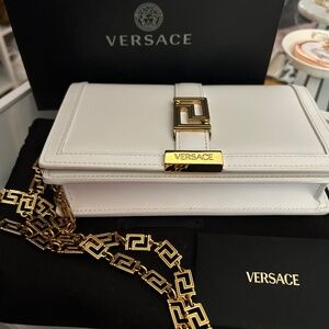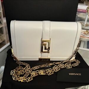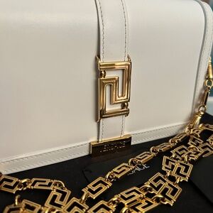 The Greca Goddess mini bag is accented by the Greca chain hardware – a signature Versace symbol, constructed from one uninterrupted line. Crafted in Italy from smooth leather, the evening bag can be worn as a shoulder or crossbody bag using its detachable chain strap.