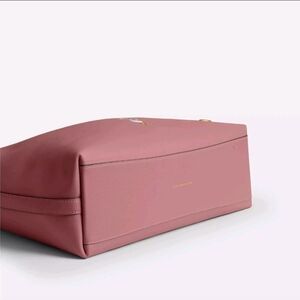 Elegant pink Coach shoulder bag. Features a playful Daisy Duck charm. Perfect for a chic look.