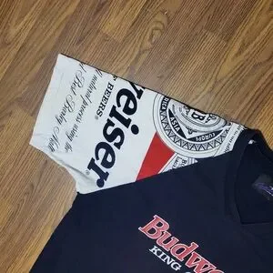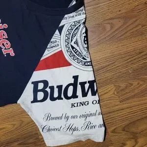 Features Budweiser logo on front. Navy blue body with white and red sleeves. Short sleeve vintage early 2000s style.