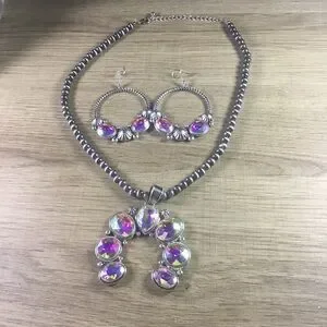Multicolored Squash Blossom Silver and Pink Jewelry Necklace Earrings Set