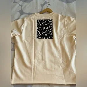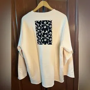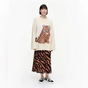 Elegance without pretense. Comfort without bulk. This cozy and chic long-sleeved cotton sweater from Marimekko features a handsome Tiger pattern in the front and a classic Unikko design on the back. No ribbed cuffs or hem, the edges look fashionably untrimmed. The fit is roomy to oversize. This sweatshirt is practical and versatile. It will work well with many of your favorite bottoms from jeans to skirts. Its color palette includes light beige, gray, brown and creamy shades. Ideal for spring and summer.