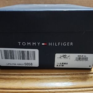 Tommy Hilfiger low-top sneaker. White leather upper with gold glitter side panels and metallic gold heel tab. Lace-up closure. Casual, eye-catching style.