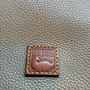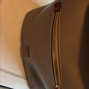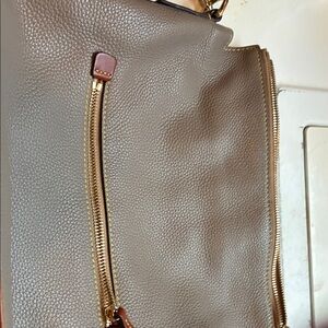 Dooney & Bourke leather shoulder hobo in elephant/gray with brown trim. Pebbled leather exterior with front zip pocket. Single wide shoulder strap for comfortable carry. Discreet branded patch at front. Timeless, versatile silhouette for daily use. I do not have the original dust cover, but I will package carefully in a pillowcase.