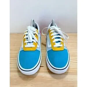 Women's Vans Ward Old Skool multicolor block sneakers. Inspired by classic skate style, they feature the iconic white Sidestripe, contrasting with a dynamic mix of turquoise, mustard, and pink. They combine durable suede and breathable canvas. Lightly worn, in excellent condition, with a small imperfection on the ankle of the right shoe. See last photo.