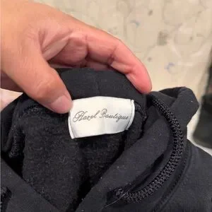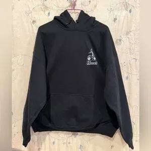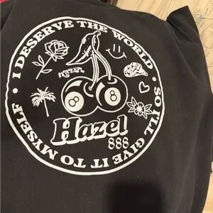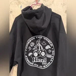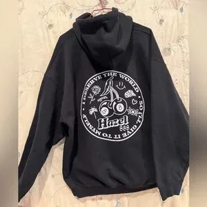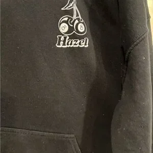 Classic black hoodie with front pocket. Features Hazel logo. Comfortable and versatile.