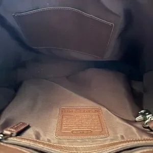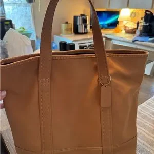 Elegant caramel leather tote by Coach. Ideal for daily use. Durable and stylish design.