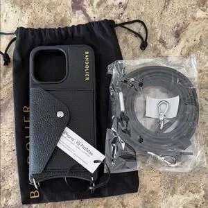 Bandolier Hailey Sode Slot leather crossbody case made for iPhone 15 Pro Max. Features a snap pocket for cards. Includes detachable long strap for hands-free wear. Gold branded lettering detail. Textured black leather exterior. NWT. Happy to supply more pics