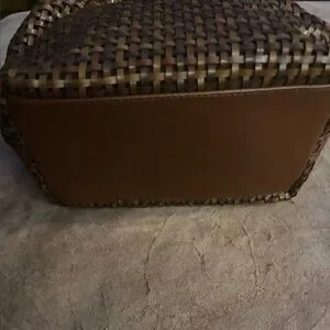 Chic woven leather design. Sturdy handles. Perfect for any occasion. 10” wide. 9”” long. 5” across bottom. 4” deep. 14” straps.