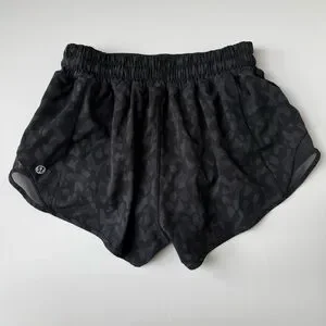 Lululemon Hotty Hot High-Rise Lined Shorts in black and grey animal print, size 4. Designed for running with lightweight Swift fabric that wicks sweat, dries quickly, and feels breathable during workouts. Features a flattering high-rise fit, 2.5” inseam, built-in liner, iconic curved hems for full range of motion, mesh ventilation panels, and discreet pockets in the side seam and liner. Excellent condition. Same day or next-day shipping.
