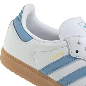Classic and iconic Adidas Samba OG J sneakers featuring a clean white leather upper with light blue 3-stripe detail and the signature gum rubber sole. Originally designed as a soccer training shoe, now a timeless everyday sneaker.