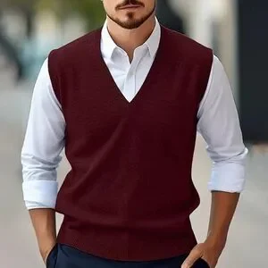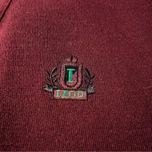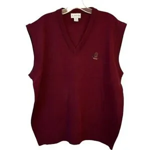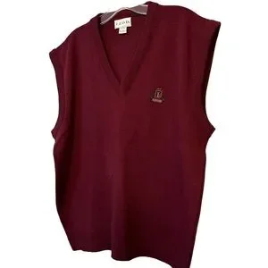 Classic V-neck sweater vest by Izod. Solid burgundy color with ribbed hem and neckline. Lightweight knit for layering. Timeless style for work or casual wear.