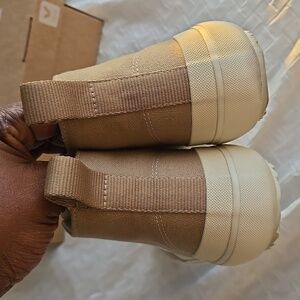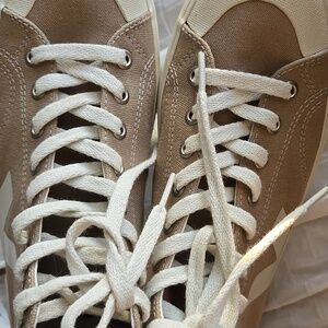 Stylish Veja sneakers in tan and cream. Features durable canvas material. Comfortable and versatile design.