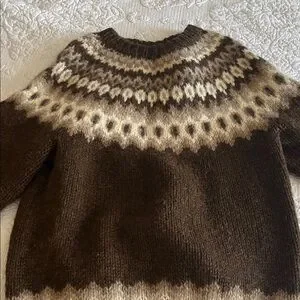 Cozy knit sweater with a brown and cream pattern. Perfect for chilly days. Hand woven and no tag or label. 100% wool