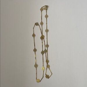 Vintage 1977 AVON Elegant gold filigree link necklace for women. 24” length. Features decorative round filigree medallions spaced along a delicate gold chain. Versatile piece that complements both casual & dress looks. Lightweight and refined with a polished gold finish. In excellent condition. Smoke & pet free home.