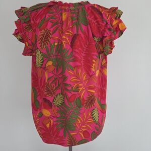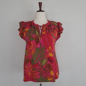 Bold and bright fuschia top with a vibrant tropical leaf print. Featuring large leaves in shades of green, yellow, orange, and deep red. Tie-neck with tassel ends. Cap sleeves with gentle ruffle detail. Lightweight, breezy silhouette for casual wear. NWT