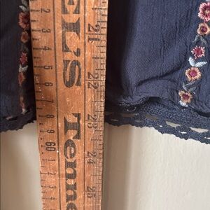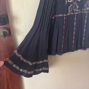 Chic navy blue blouse with floral embroidery. Features long bell sleeves and a flowy fit.