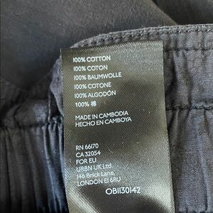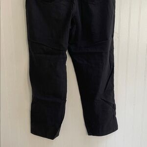 Washed black color. High waisted. Side slant and back patch pockets. Pull-on styling, elastic waist. Removable sash style belt. Cuffs can be rolled. Tapered leg.