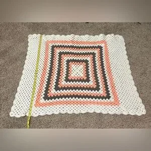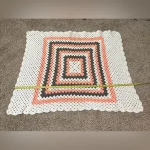 Handmade Crochet Square Throw Blanket in White, Coral & Gray