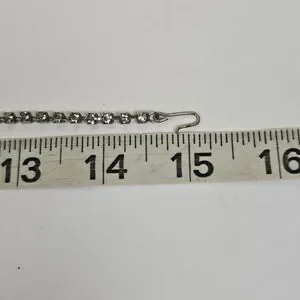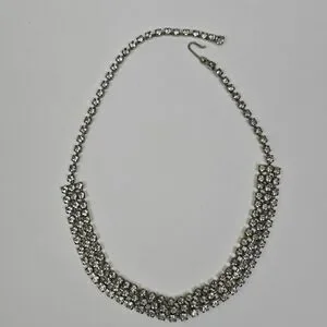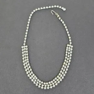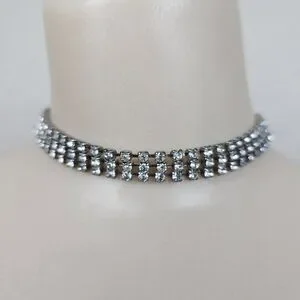 This Vintage 3 Row Clear Crystal Rhinestone Collar Choker Necklace is a stunning piece of retro 60s jewelry, measuring 15 inches in length. The necklace features a hook closure and is made of white/colorless prong set round crystal rhinestones set in silver tone metal, giving it a classic and elegant look. This original vintage choker is a timeless accessory for women, adding a touch of glamour to any outfit. In very good pre-owned condition-did not see any dark stones.