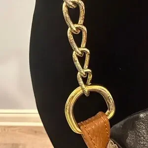 Elevate your style with this chic black crossbody bag featuring a stylish tan accent and elegant chain strap. Perfect for any occasion.