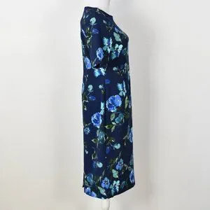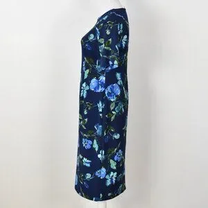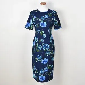 Crew neckline. Short sleeves. Back zipper. Fitted, sheath style. Midi length. Stretch material. Not lined.