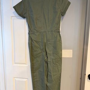 Utility-style jumpsuit with short sleeves and button-front closure. Front patch pockets and waist detailing for a structured fit. Casual, versatile piece in durable fabric. Easy to style for everyday wear.
