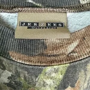 Vintage Jerzees Outdoors camo sweatshirt featuring a realistic woodland camouflage pattern with oak leaves and tree bark details.