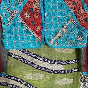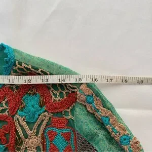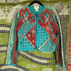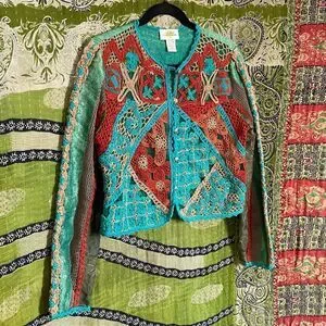 Rare Vintage Sandy Starkman Aqua Patchwork/ Embroidered Boho Cardigan Size Small