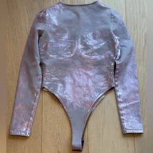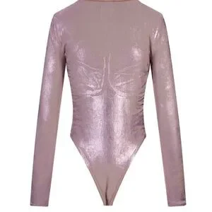 The lustrous metallic finish catches the light beautifully, creating a dimensional glow that elevates any outfit. Designed with sculpted cups and a flattering high-cut bodysuit fit that pairs effortlessly with denim, leather pants, or a mini skirt.