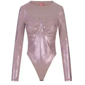 Keywords: metallic bodysuit, bustier top, corset bodysuit, designer statement piece, iridescent top, festival outfit, night out bodysuit, runway style, Diesel designer top.